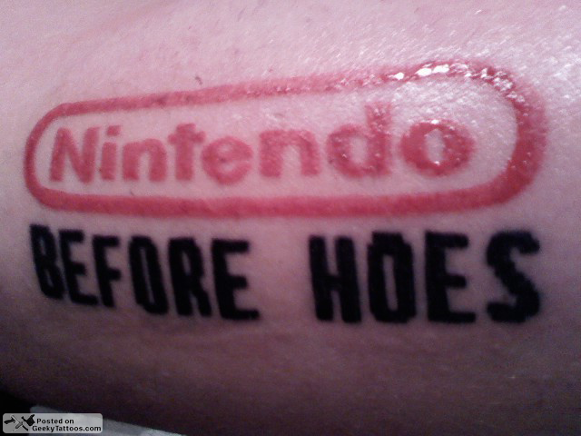 I got this tattoo after hearing the song “The Game Master” by Madhatter where a line just out of nowhere says “Nintendo’s before hoes”. After that I just whipped this up on Microsoft paint. When I visited home in CA I took it to my buddy Bob’s shop and had it done. I took out the s off “Nintendo’s” because I wanted to use the Nintendo logo, but it looked really weird with it.