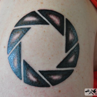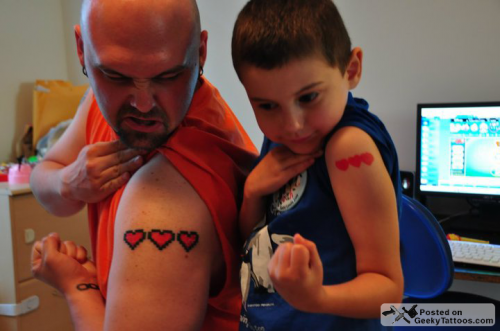 Jason‘s got a mix of old school gaming with the 8-bit Zelda hearts as well as new school gaming with both the Aperture logo and BioShock chains. He says the 3 hearts are for his wife, son, and daughter. The Aperture logo? A double whammy since he loves photography and Portal! I’d ask more about what’s up with the chains, but I dunno if I want to know that much about Jason!
