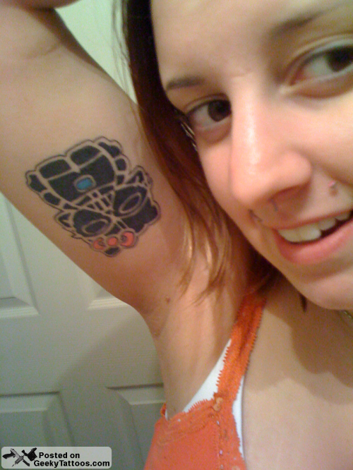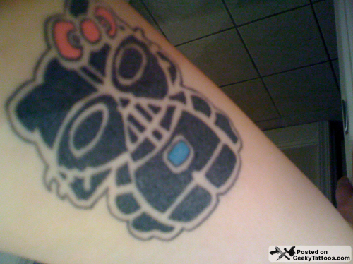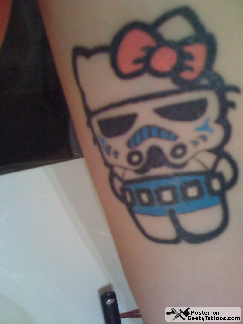 Stephanie sent in her pair of geekified Hello Kitty tattoos. She combined her lifelong love of Star Wars with a little bit of girlyness (her own words) and ended up with Darth Kitty and Stormtrooper Kitty. Nice mix Stephanie!