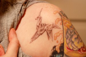 Subspace has a beautiful tattoo of an origami that any geek should instantly recognize from Bladerunner. (No, seriously if you don’t know what this is from, you have some movie watching to do.) When I asked her what her motivation for choosing the unicorn was, she replied, “I love Blade Runner, what can I say” She also wondered why I was asking her about a tortoise.