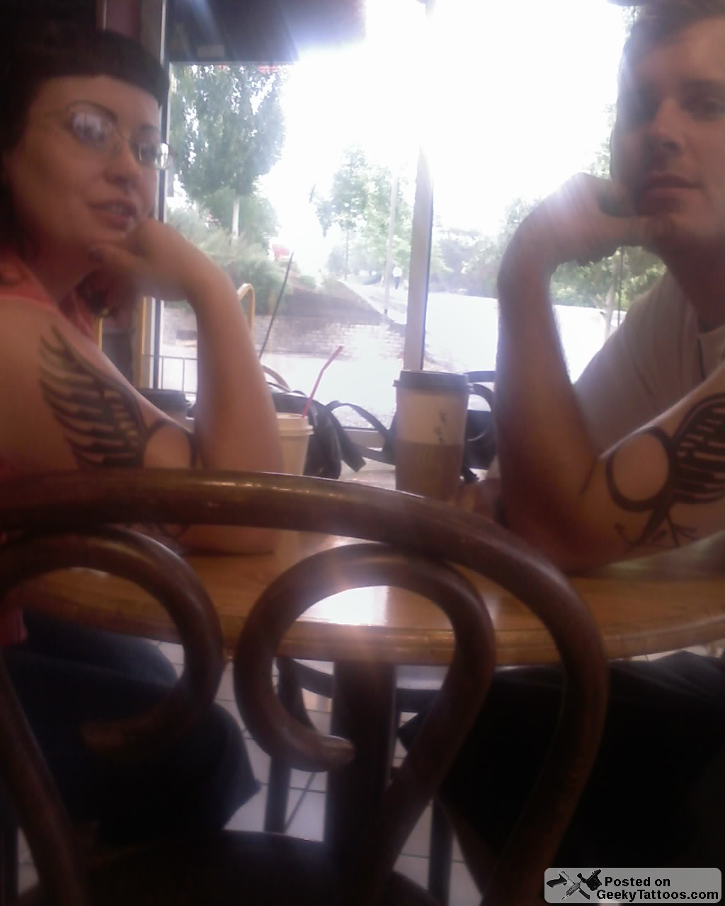 I was JUST Googling this this morning to see if anyone had done BSG matching tats. I have an insane crush on Starbuck, so love this tattoo completely, but would NEVER be able to talk my man into it. Le sigh…