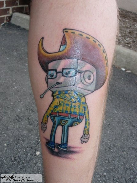 Ken, aka Cowboy Kenbot, sends in the tattoo he got done at Hybrid Tattoo. He says he loves Star Wars and loved this shirt when it came out, so he decided to get it tattooed. But it’s not his only geeky tattoo, he’s also got a robot cowboy version of himself.