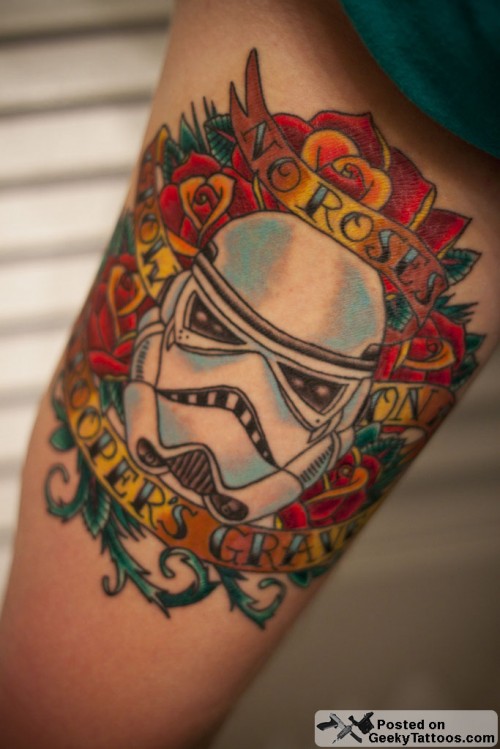 Credit for the artwork goes to Adam Hayes of Red Rocket Tattoo in NYC, it’s his design. He specializes in Star Wars Americana work.