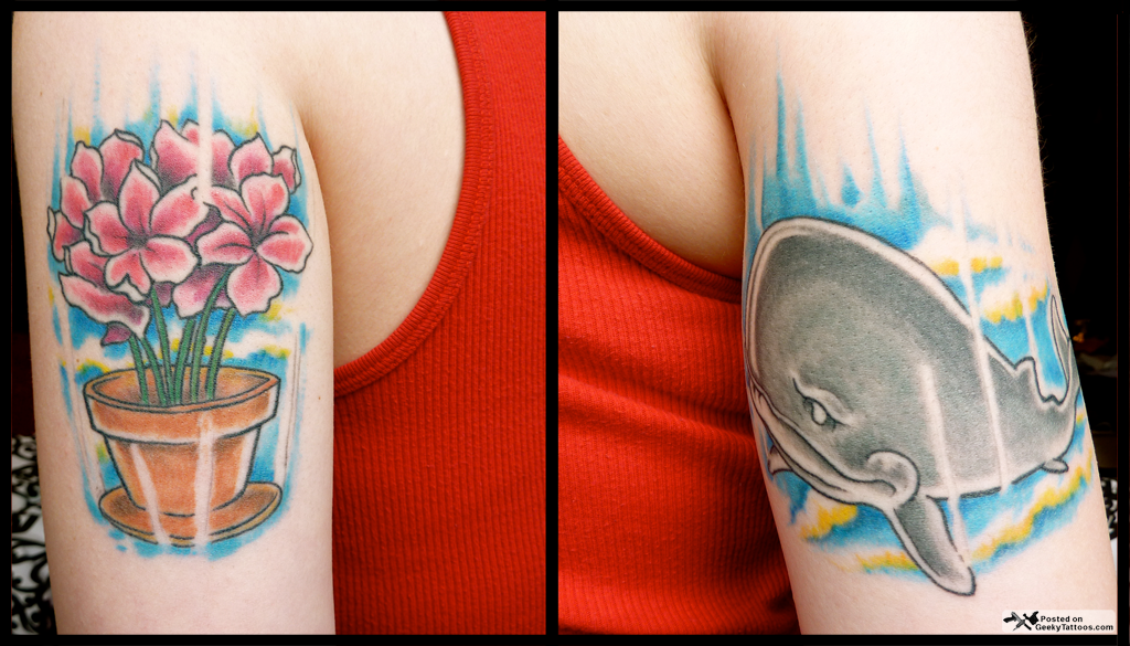 Tattoos inspired by The Hitchhiker’s Guide to the Galaxy are always welcome on Geeky Tattoos. So I’m happy to post this pair of tattoos from Emily Holodnick in Bellingham, WA. The petunias are on the back of her left arm and the whale on the back of her right arm. She says she had the idea for this tattoo while at Hitchcon ’09 in London and explains that she wanted to commemorate her favorite scene in one of her favorite books.