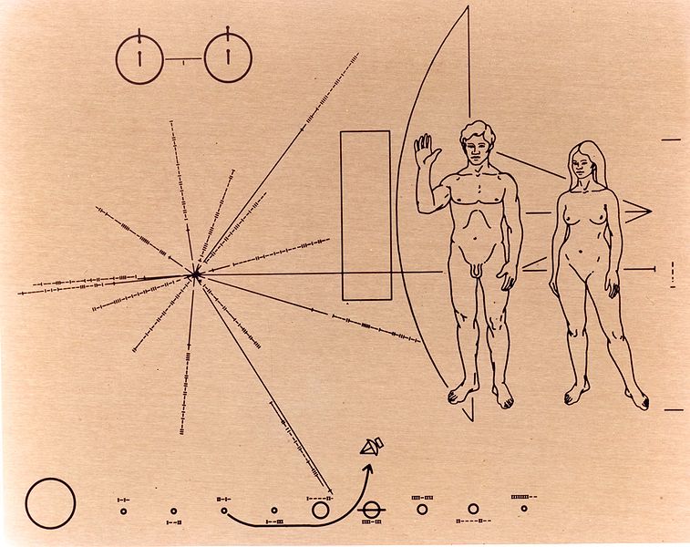 Ed Note: This post has been sitting in my inbox for quite some time now. Every time I would sit down to write it, I’d get sucked into learning about all the spacecrafts we’ve shot into space and how they’re going thousands of miles an hour and are billions of miles away. Plus the controversy over the plaque, what it was intended to mean, etc. I highly recommend setting aside an hour to get lost in Wikipedia and all the related sites.