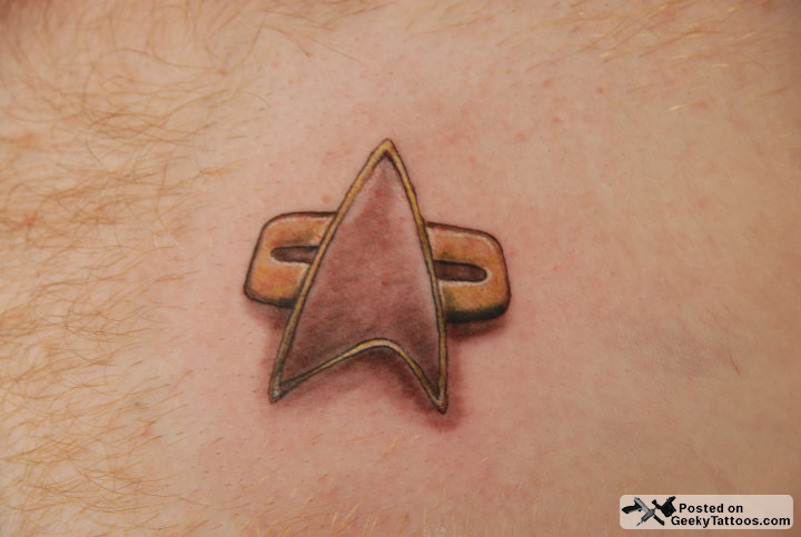 I've seen a few comm badge tattoos, but this has to be the nicest-looking one. Metallic surfaces can be really hard to get right but this does, the shading and shadows give a great 3D effect, and even details like where the shield reflects subtle highlights onto the crossbar behind it really makes the thing pop. Kudos to the artist!