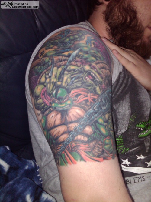 Turtles on a half-sleeve! Check out this rad Teenage Mutant Ninja Turtles half-sleeve tattoo that Justin got done by Troy at Sacred-X-Pressions. He says he has Shredder on the other side, so I’m not sure whether he supports the Turtles or is secretly a part of the Foot Clan. If my VCR suddenly goes missing, I guess I’ll know.