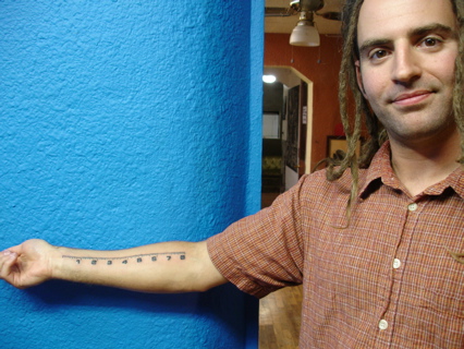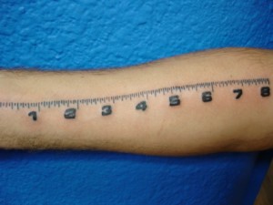Mikey Sklar never has to stop and look for a ruler. I’m jealous. He says he uses this tattoo every day as he and his girlfriend are building a unique hotel (Holy Scrap Hot Springs) out of reused materials in Truth or Consequences, NM. He’s also a long time geek who dabbles in electronics, code, and even a bit of fire art. He made an RFID secured fire trampoline a couple years back. His tattoo was featured in Inked: Clever, Odd and Outragous Tattoos
