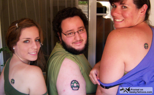 My name is Danielle (I’m on the right in the picture.) My brother (Ray) and sister (Natalie – the short one) and I just got some geeky tattoos together. I know the 1-up mushroom tattoo in particular is pretty popular, but we decided to get it as a “sibling tat”. We don’t really have the same tastes in almost anything else, but the old school Mario Bros. is something we all connect to and connect with our childhood. We had been planning this for a while, and it worked out perfectly that we could get it done right around Ray’s 20th birthday, and Natalie’s high school graduation. They live in California and I in Las Vegas, so they came down for the weekend and we got it done at LV Ink House by Patrick (me and Ray) and Donovan. The family that tattoos together, stays together, right?